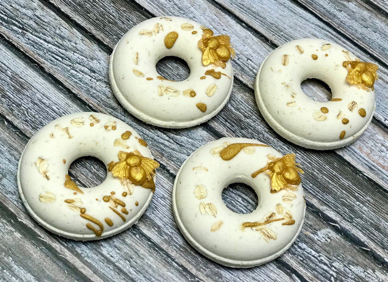 Enjoy all the sweetness of donuts without any of the carbs! Sweet scent that is☺️Relax in a tub of hot water and Creamy Milk & Caramel Honey with real Oatmeal! Let cocoa butter and Aloe Vera oil drench dry skin with moisture😍 As far as stress goes, let it melt away with Comforting fragrance and swirls of moisture! These bath bombs make your skin feel beautiful! They are sure to melt away your stress and replace it with being.. well just relaxed😍 Includes 3 life size donut bath bombs in a sweet gift box with bow🤗 Each donut has a golden soap bee and cocoa butter drizzle on top for extra moisture ❤️ Gift ready!! Individually wrapped and labeled inside box!